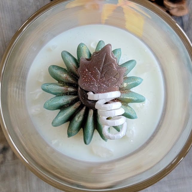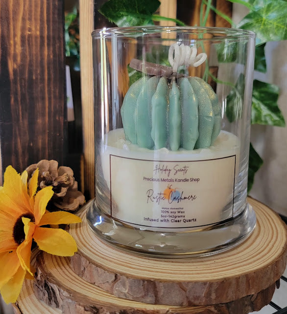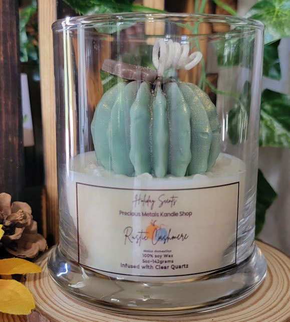 Rustic Cashmere is rustic yet elegant kandle. The beautiful blue/ green pumpkin-harvest, abundance and blessings. A creamy white base with clear quartz- a clean and fresh energy with clarity for a clear mind. The fragrance of this beautiful kandle is very calming. You will pick up notes Tonka Bean, Mandarin and Vanilla. Subtle hints of Tabacco, Nutmeg and Cedar. All these together gives a familiar scent of light perfume.
