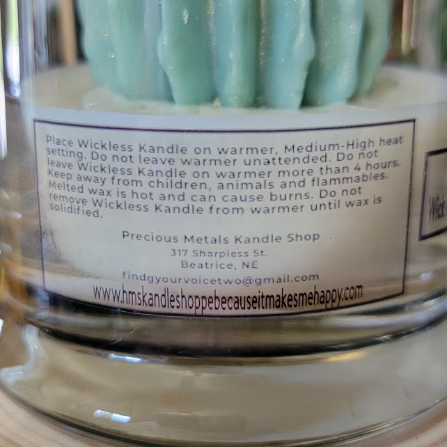 **WARNING-Do not leave warmer unattended. Do not leave Wickless Kandle on warmer more than 4 hours. Keep away from children, animals and flammables. Melted wax is hot and can cause burns. Do not remove Wickless Kandle from warmer until wax is solidified.
