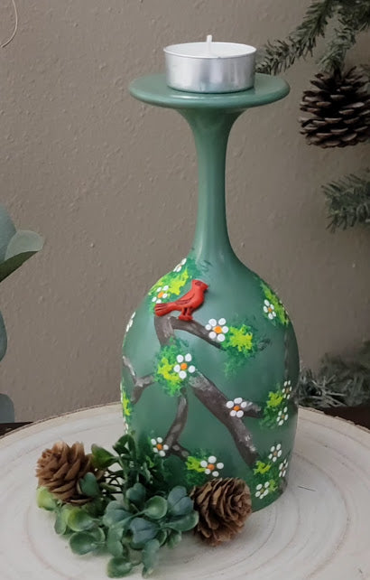 These are beautiful hand painted upcycled wine glasses. Perfect for any occasion. All different sizes and designs. Includes: 1 wine glass holder, 2 TeaLights and 1 glass votive.